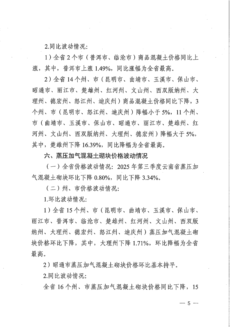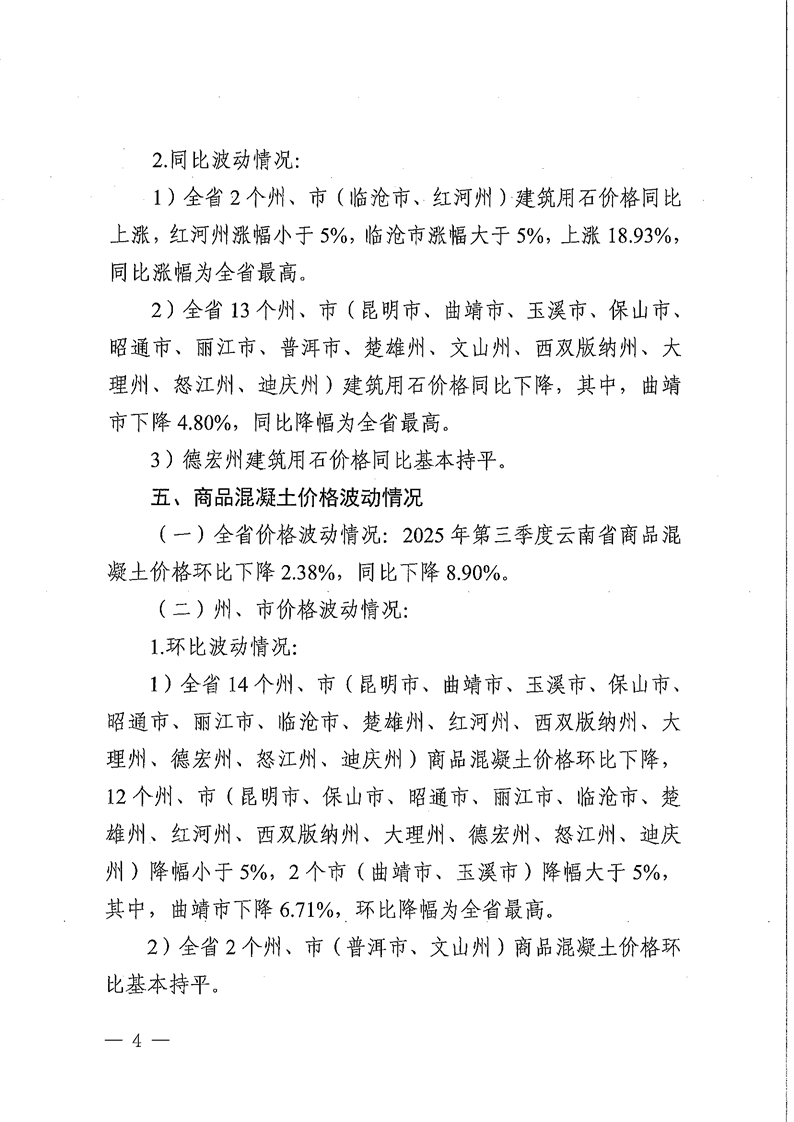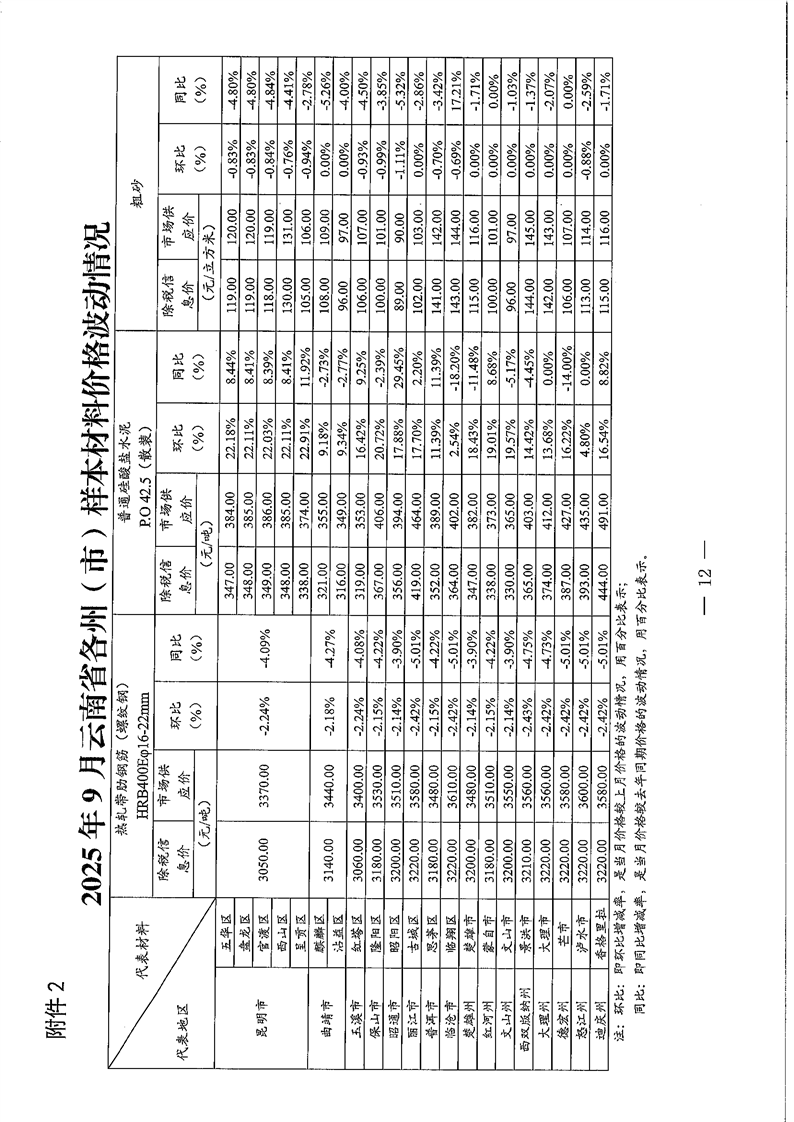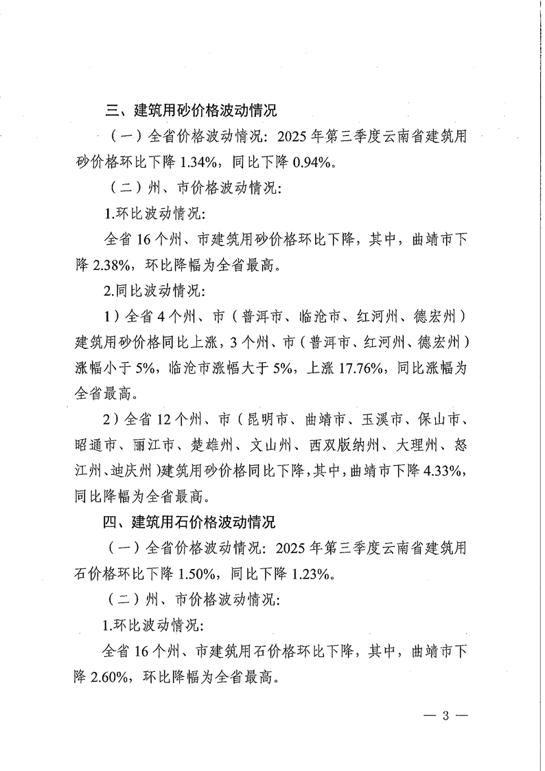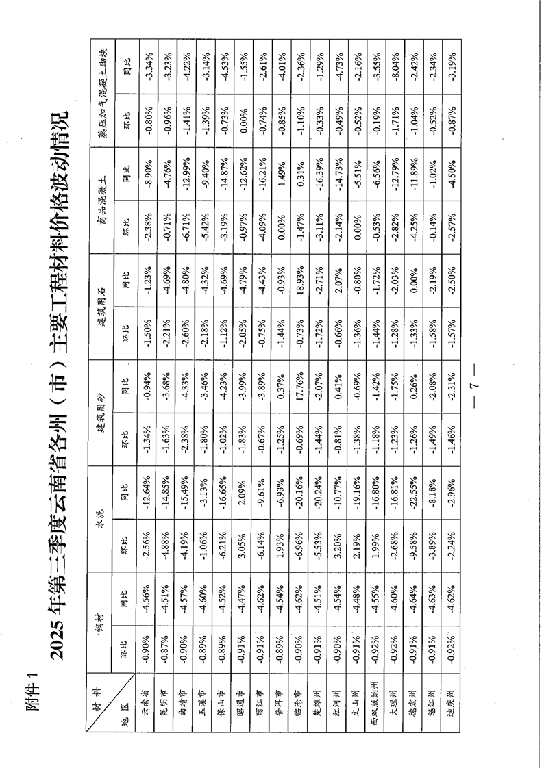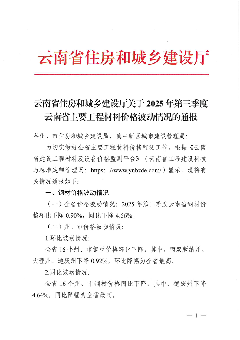 云南省住房和城乡建设厅关于2025年第三季度云南省主要工程材料价格波动情况的通报
