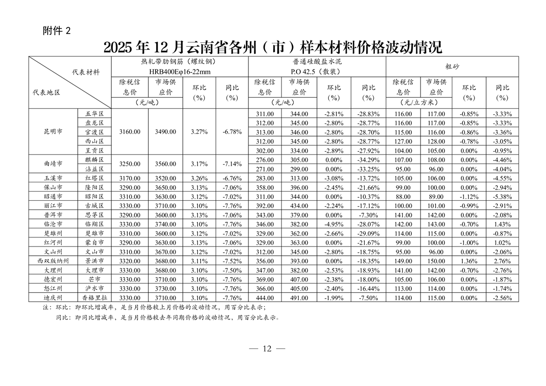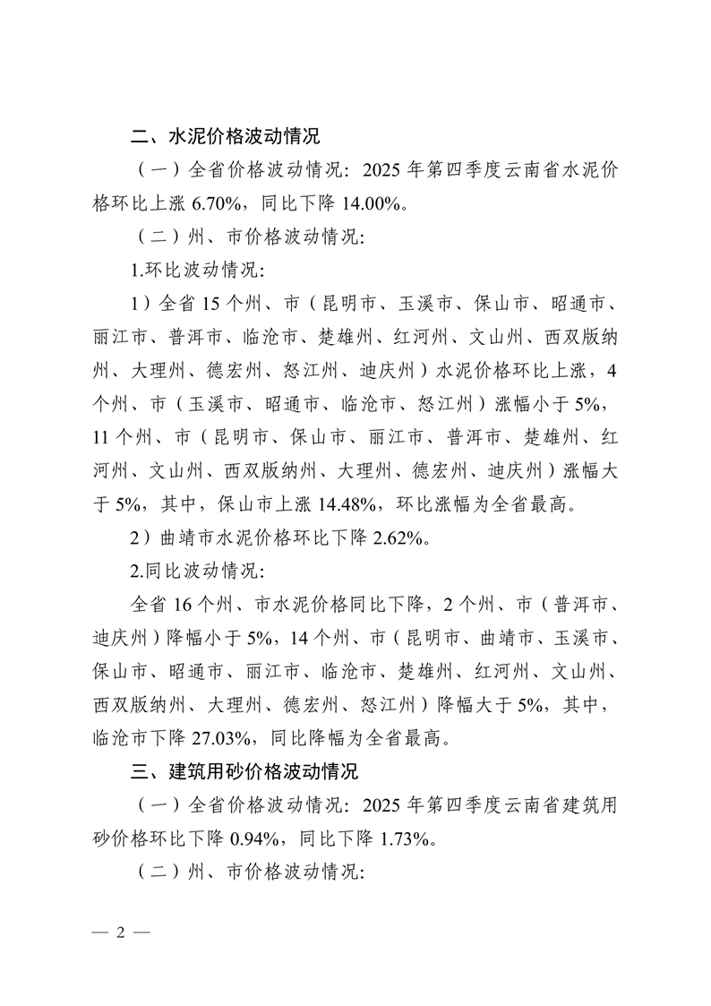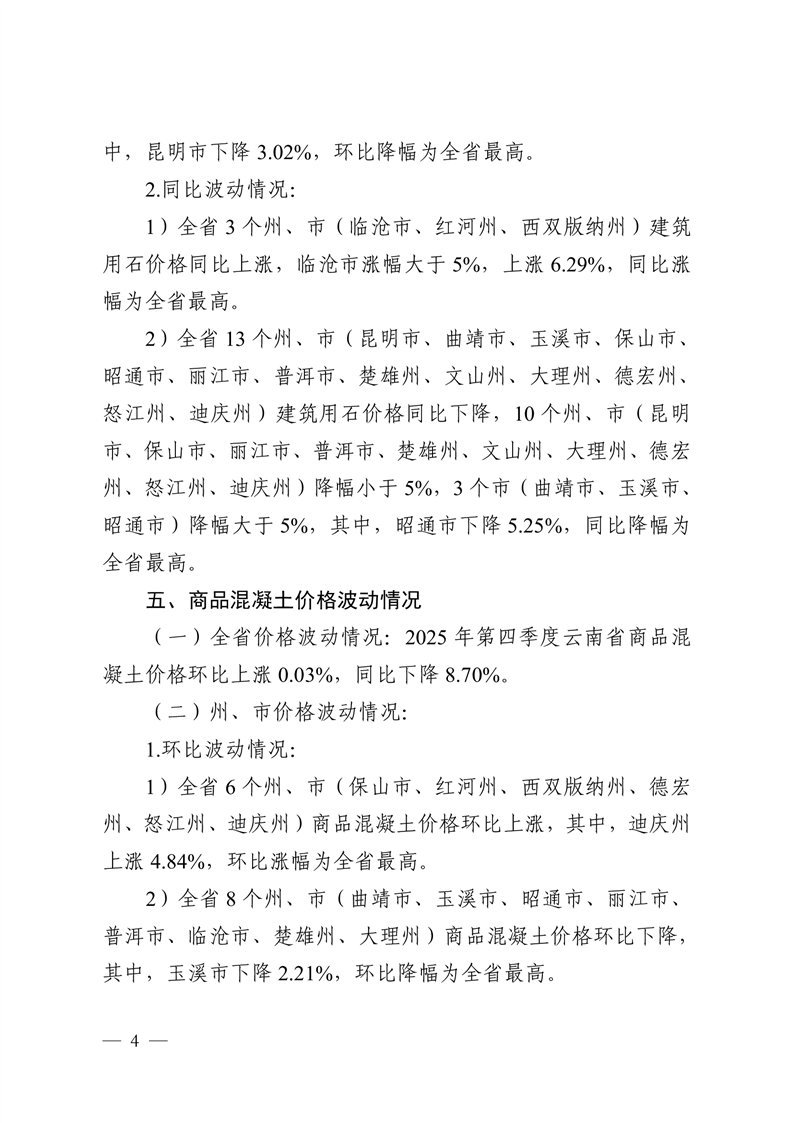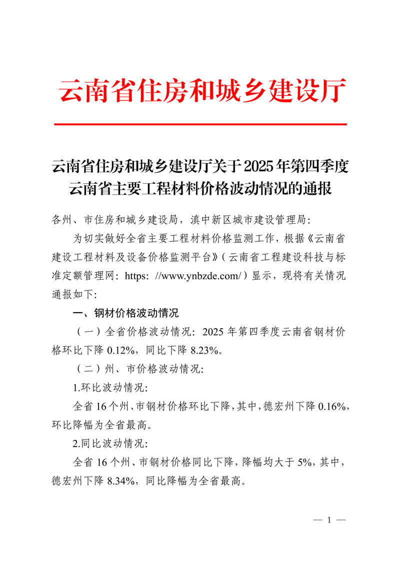 云南省住房和城乡建设厅关于2025年第四季度云南省主要工程材料价格波动情况的通报