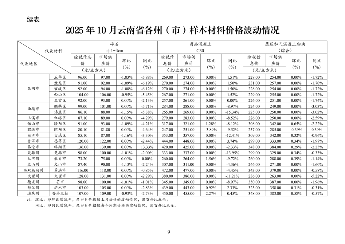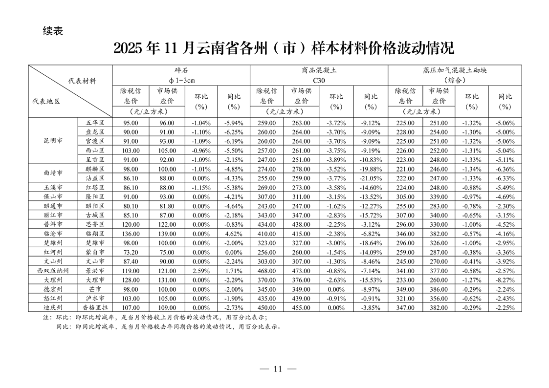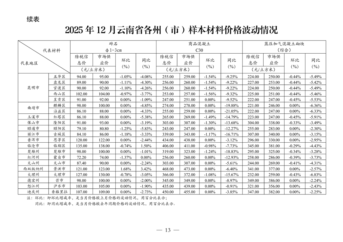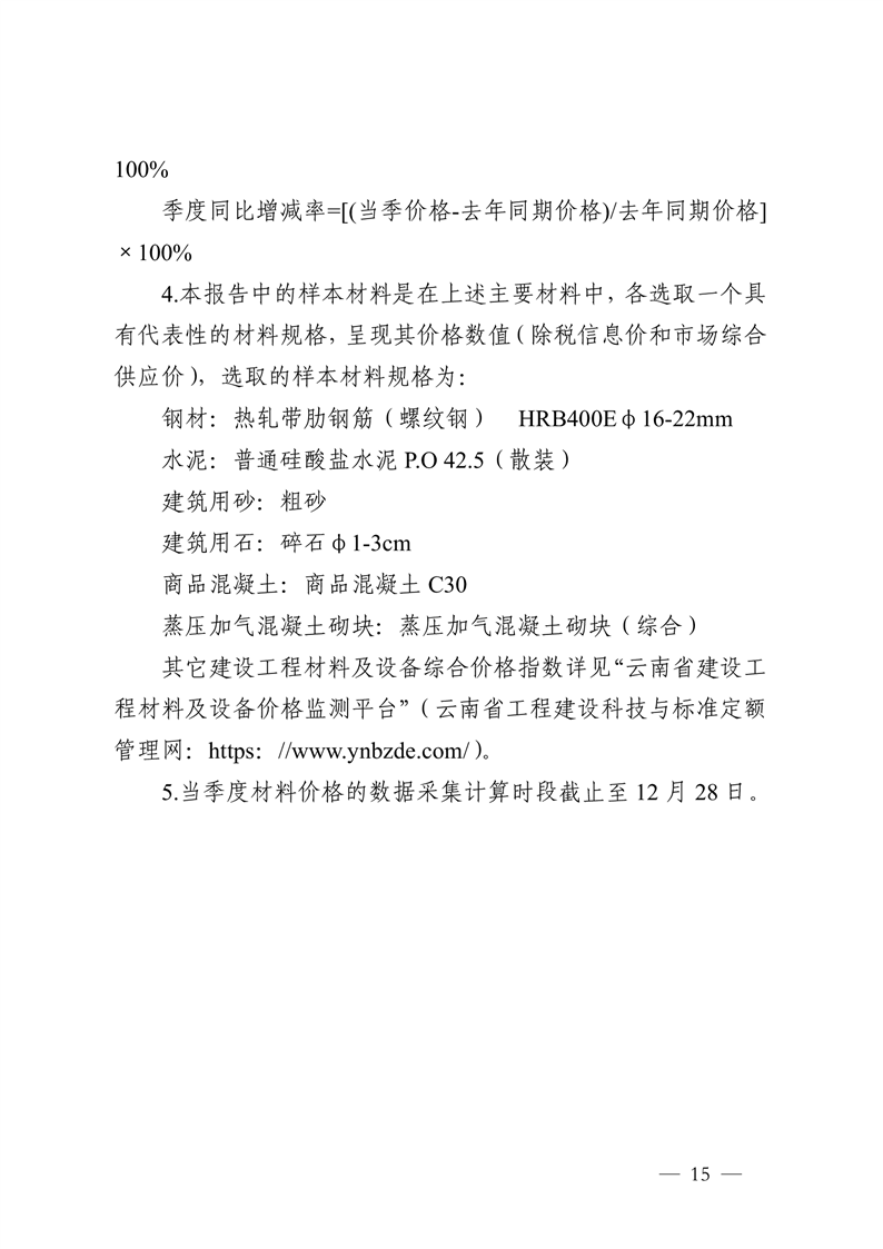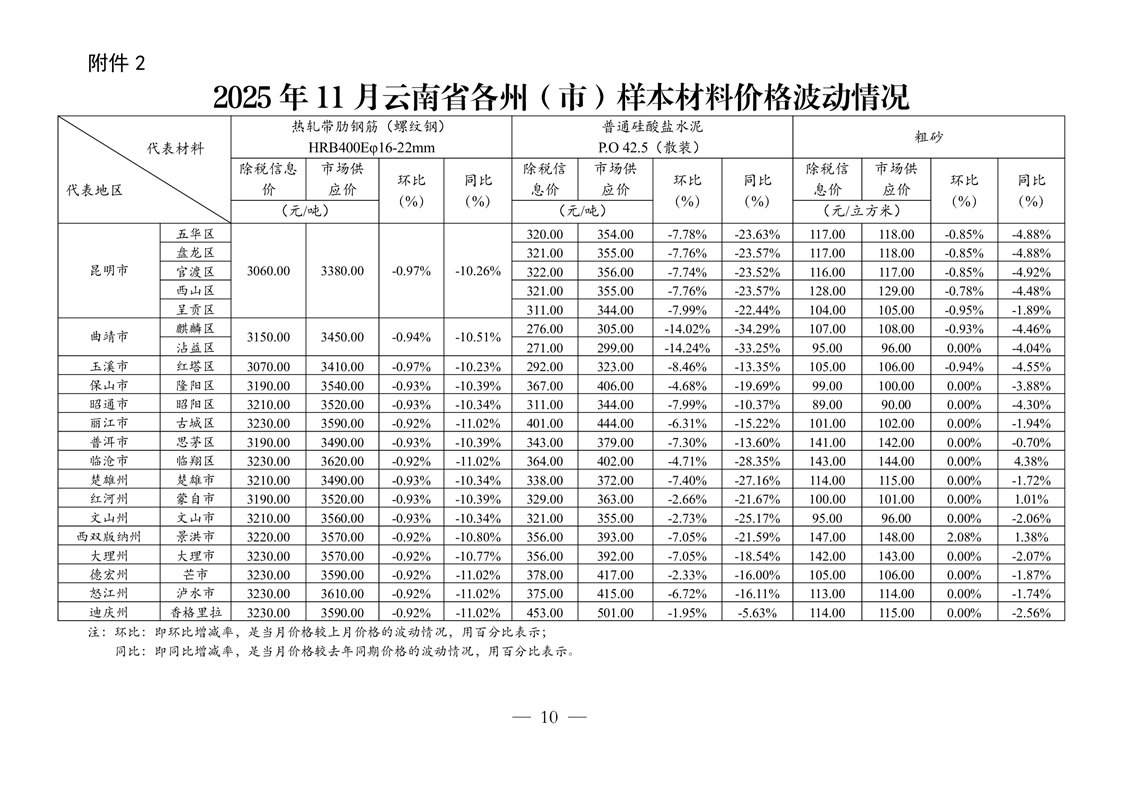 云南省住房和城乡建设厅关于2025年第四季度云南省主要工程材料价格波动情况的通报