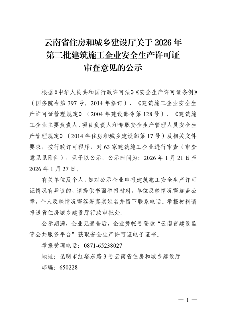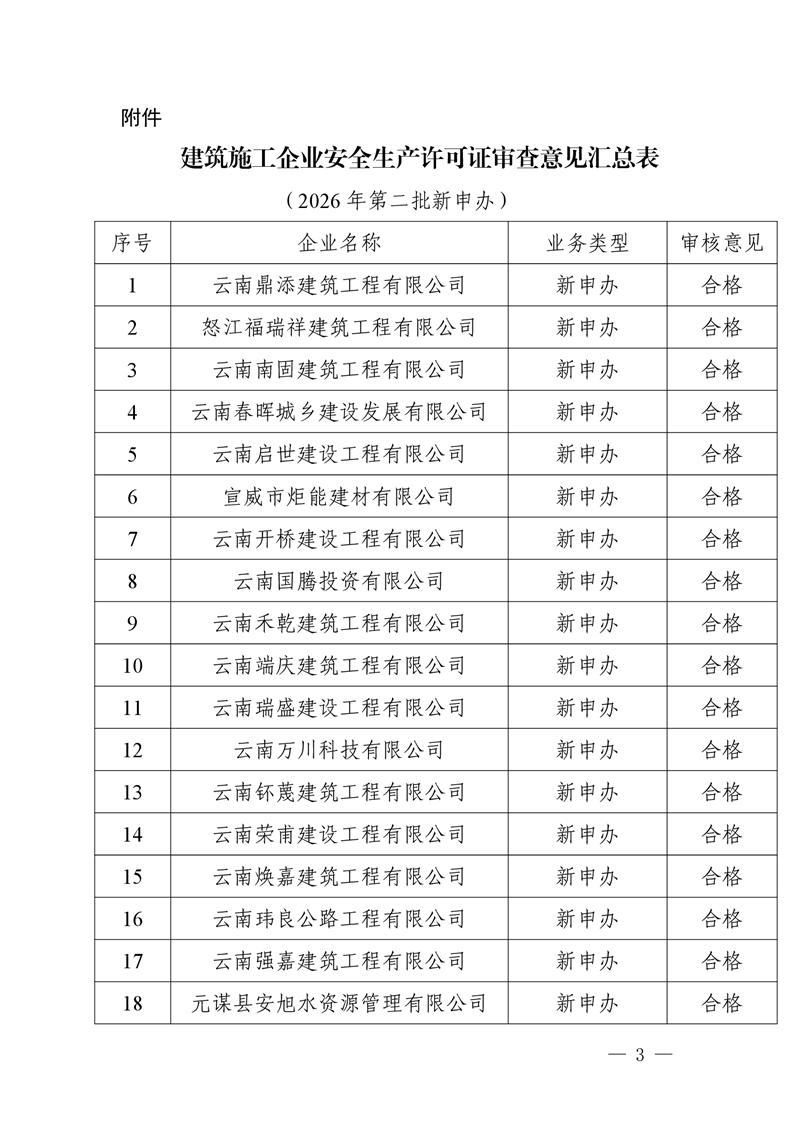 云南省住房和城乡建设厅关于2026年第二批建筑施工企业安全生产许可证审查意见的公示