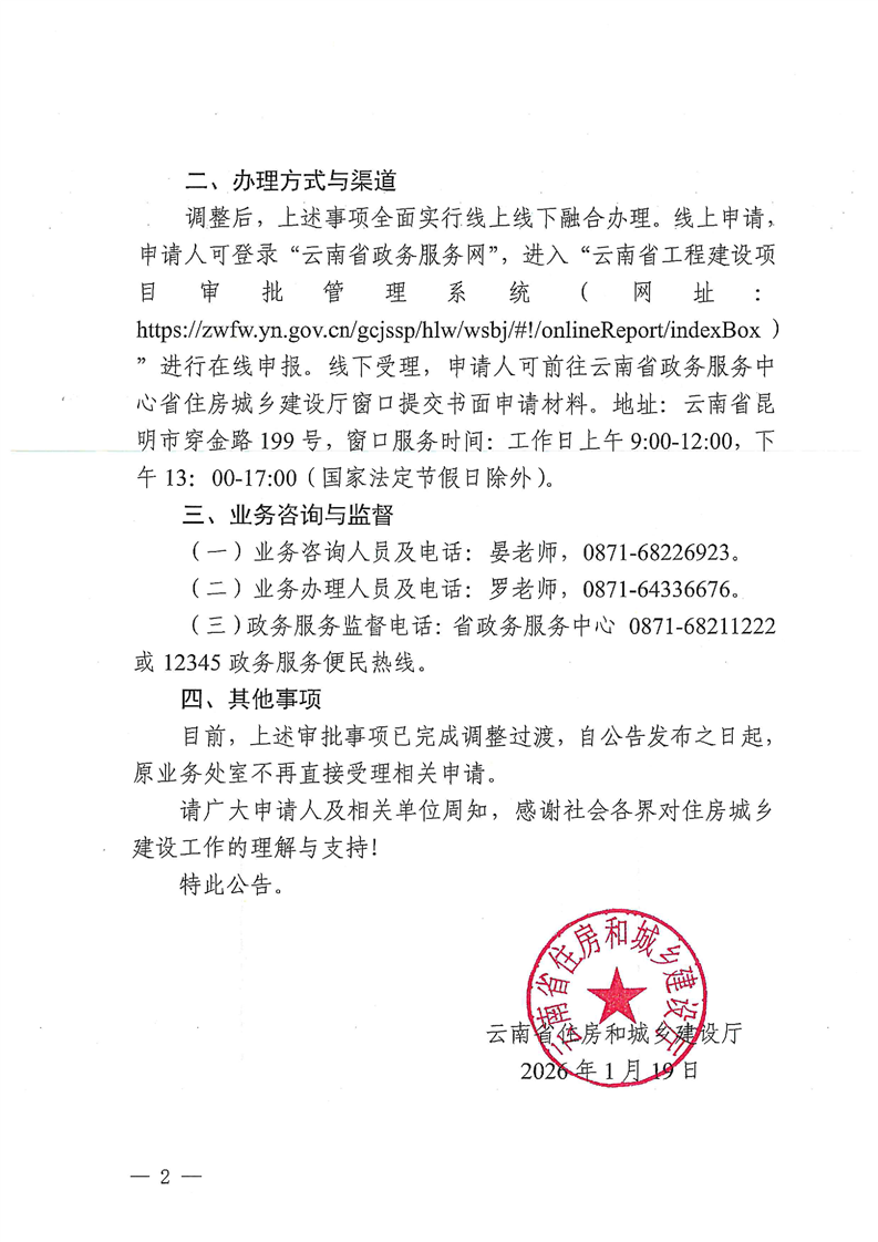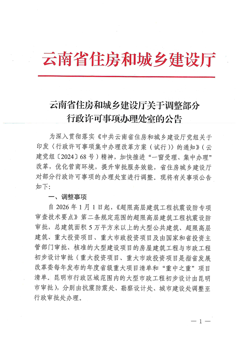 云南省住房和城乡建设厅关于调整部分行政许可事项办理处室的公告