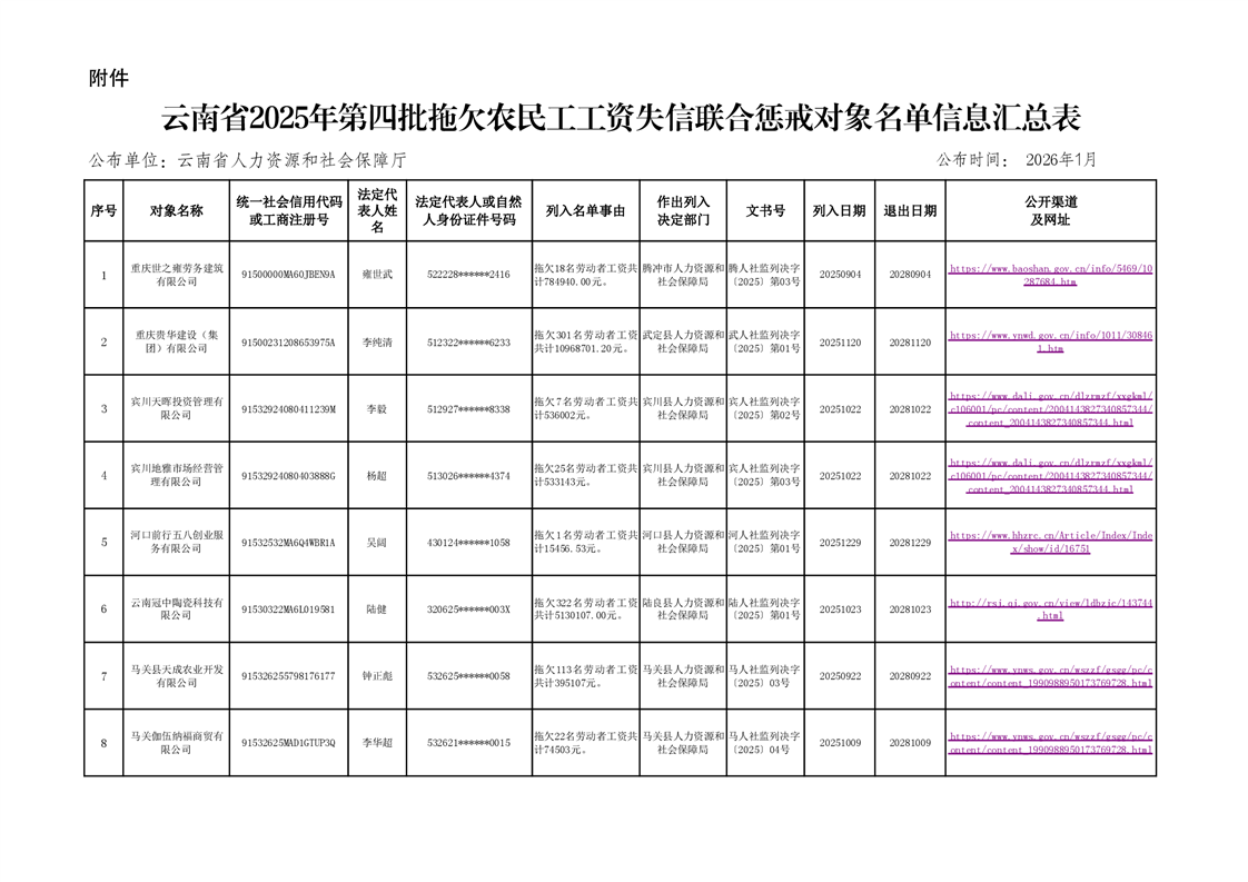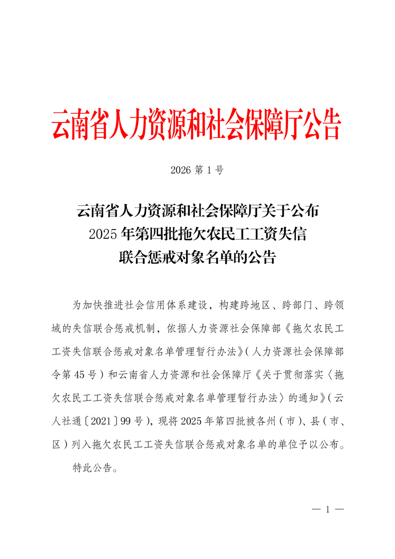 云南省人力资源和社会保障厅关于公布2025年第四批拖欠农民工工资失信联合惩戒对象名单的公告