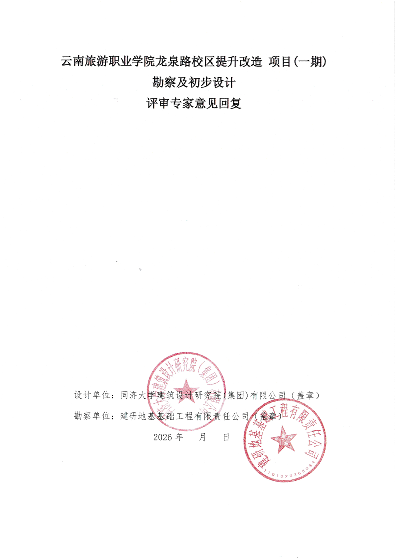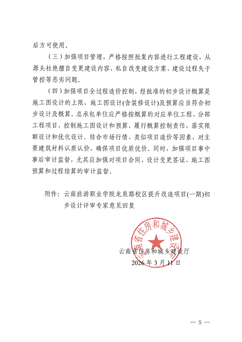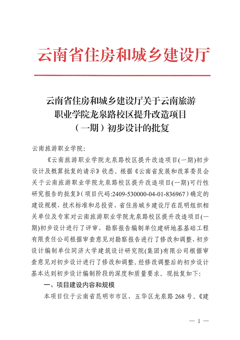 云南省住房和城乡建设厅关于云南旅游职业学院龙泉路校区提升改造项目(一期)初步设计的批复