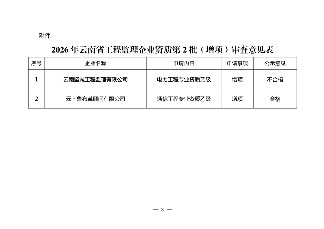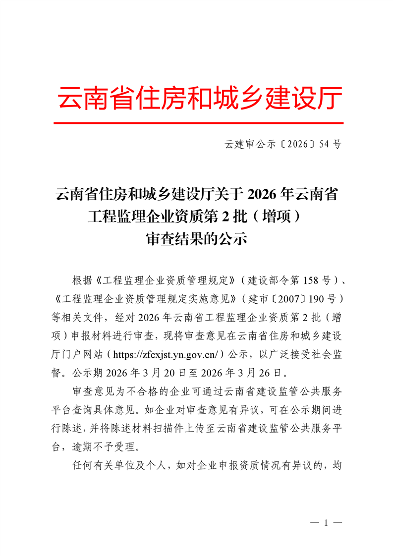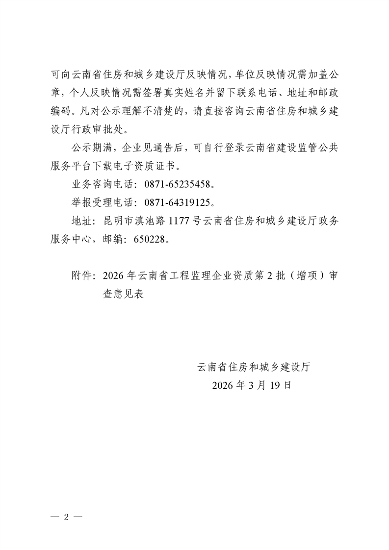 云南省住房和城乡建设厅关于2026年云南省工程监理企业资质第2批(增项)审查结果的公示